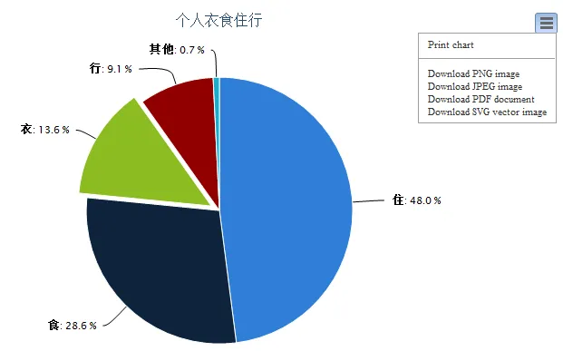 1 <script type="text/javascript"> 2 $(function () { 3 $('#container').highcharts({ 4 chart: { 5 plotBackgroundColor: null, 6 plotBorderWidth: null, 7 plotShadow: false 8 }, 9 title: { 10 text: '个人衣食住行' 11 }, 12 tooltip: { 13 pointFormat: '{series.name}: <b>{point.percentage:.1f}%</b>' 14 }, 15 plotOptions: { 16 pie: { 17 allowPointSelect: true, 18 cursor: 'pointer', 19 dataLabels: { 20 enabled: true, 21 color: '#000000', 22 connectorColor: '#000000', 23 format: '<b>{point.name}</b>: {point.percentage:.1f} %' 24 } 25 } 26 }, 27 series: [{ 28 type: 'pie', 29 name: '衣食住行', 30 data: [ 31 ['住', 45.0], 32 ['食', 26.8], 33 { 34 name: '衣', 35 y: 12.8, 36 sliced: true, 37 selected: true 38 }, 39 ['行', 8.5], 40 41 ['其他', 0.7] 42 ] 43 }] 44 }); 45 }); 46 </script>
