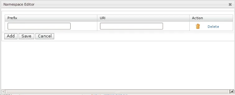添加命名空间 - 按一下从Namespaces link的配置节命名空间链接调用此对话框。 XML命名空间提供了一个简单的方法使用可扩展标记语言文件关联URI引用确定的命名空间限定的元素和属性名。输入前缀和URI,标识。
