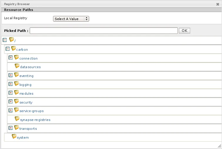 注册表提供了一种机制的创建和存储配置元素外ESB。这些注册表的内容可以动态加载或修改,这将使运行时修改ESB的行为。文件夹结构,给出了一个明确的说法,现有的文件和方便地访问修改的文件。一旦这些文件被加载,其内容缓存在ESB为指定的持续时间,以及更新的缓存期结束。