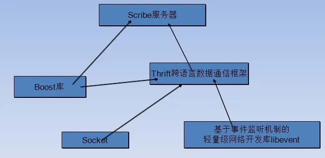 如上图所示:Scribe服务器底层数据通信框架是Thrift,Thrift也是Facebook开源的,并得到了广泛的使用。也用到了C++的准标准库boost,主要使用共享指针和文件相关的功能。Thrift也用到了libevent开发库和socket编程技术。
