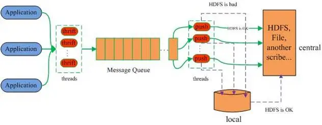 如上图所示:Scribe从各种数据源上收集数据,放到一个共享队列上,然后push到后端的中央存储系统上。当中央存储系统出现故障时,scribe可以暂时把日志写到本地文件中,待中央存储系统恢复性能后,scribe把本地日志续传到中央存储系统上。