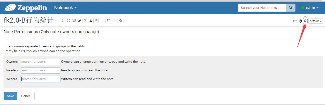 会显示Note Permissions点击后出现上图所示可以填写该notebook的Owners(所有者)、Readers(只读用户)、Writers(读写用户),这样每一个notebook就可以归属于某一个具体的用户了,避免了多用户同时使用zeppelin可能造成的冲突。