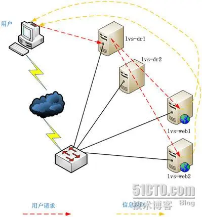 ⑴、用户访问网站的请求首先到达lvs-dr1并通过脚本设置判断如何转发用户请求。