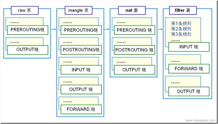 表(tables)提供特定的功能,iptables内置了4个表,即filter表、nat表、mangle表和raw表,分别用于实现包过滤,网络地址转换、包重构(修改)和数据跟踪处理。