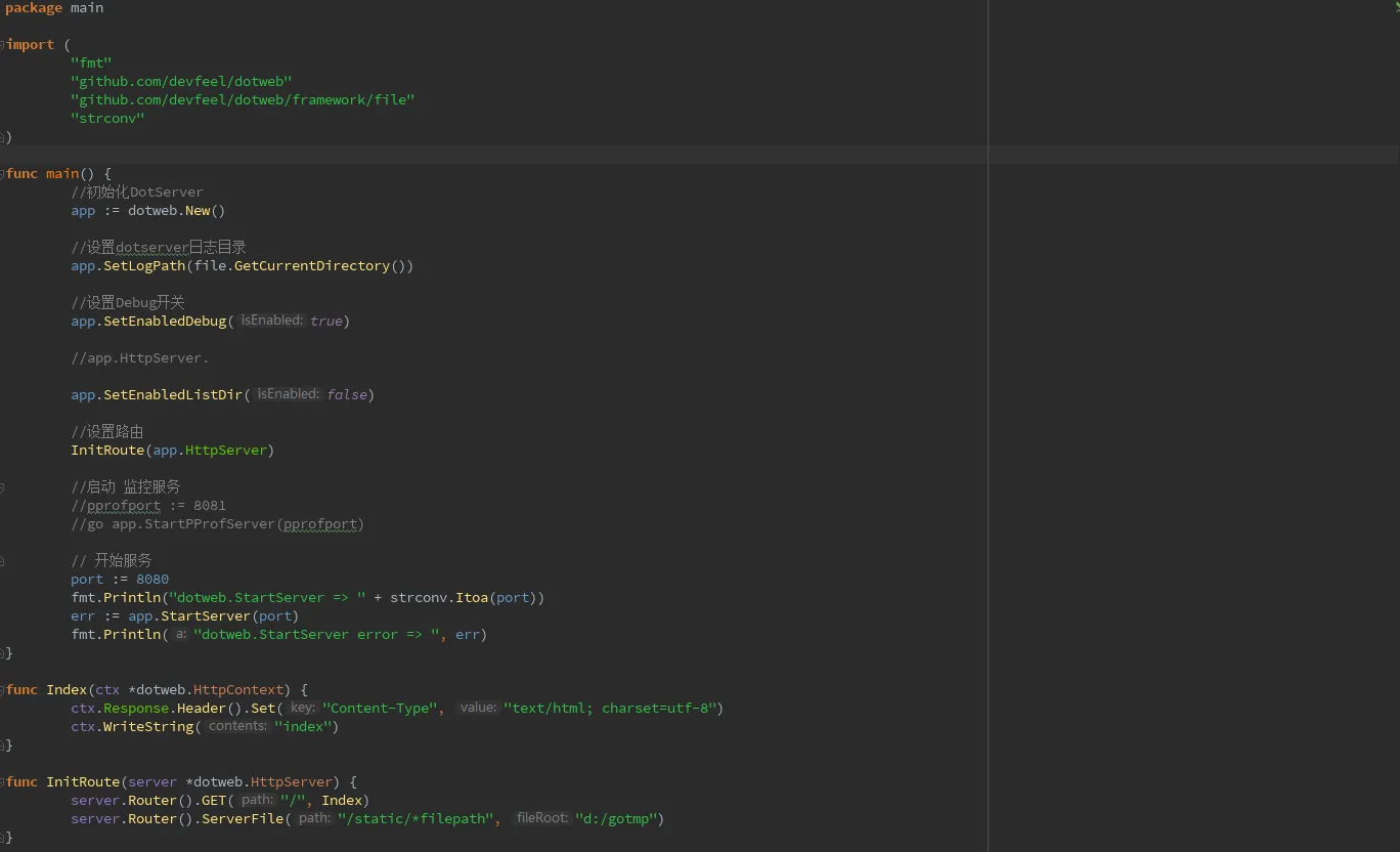 以上的代码截图表示启动一个dotweb服务,在浏览器里输入127.0.0.1:8080,将会得到一个“index”的页面。
