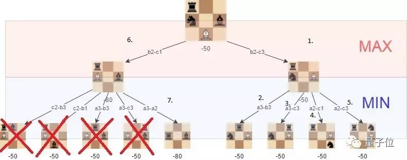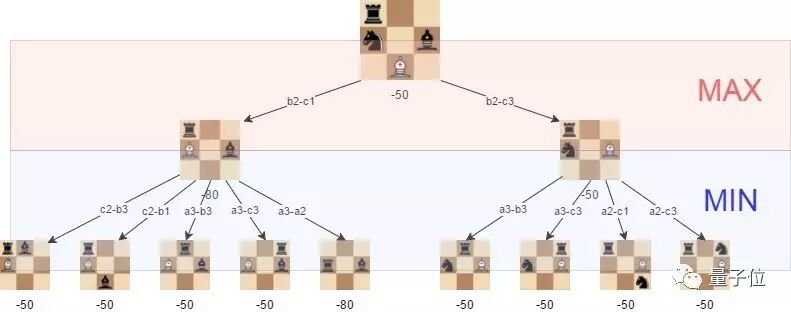 图4:在人为选择位置时,可视化极大极小算法。白棋的最佳走法是b2-c3,此时能够达到评估为-50的位置
