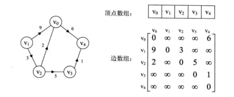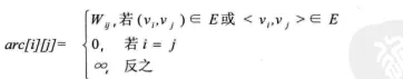 这里的wij表示(vi,vj)上的权值。无穷大表示一个计算机允许的、大于所有边上权值的值,也就是一个不可能的极限值。下面左图就是一个有向网图,右图就是它的邻接矩阵。