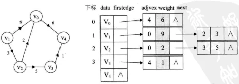 对于带权值的网图,可以在边表结点定义中再增加一个weight的数据域,存储权值信息即可。如下图所示。