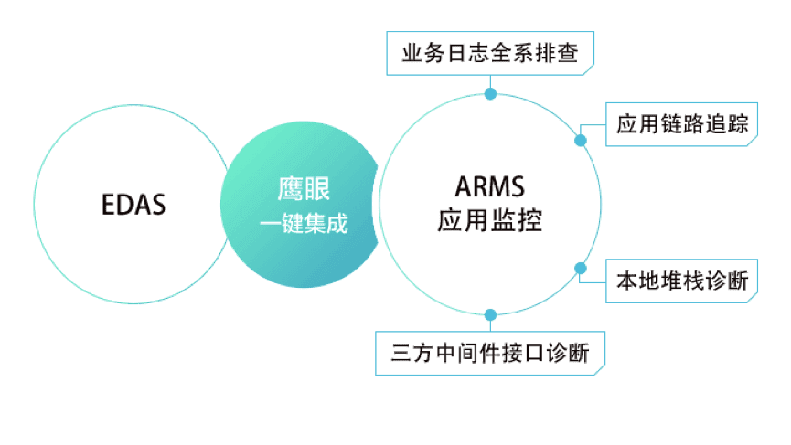 • 和Aliware无缝集成:新推出的ARMS应用监控将和已有的Aliware如EDAS平台将无缝集成,用户可以在EDAS上一键接入ARMS,后台Agent植入完全透明化。