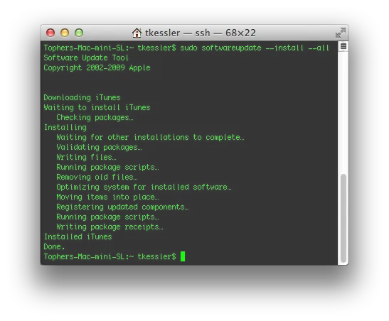 还有一呢种办法,执行 sudo softwareupdate -ia && sudo reboot 命令行,当第一个命令成功执行之后,设备才会重启。如果无法重启,用户会看到错误提示。