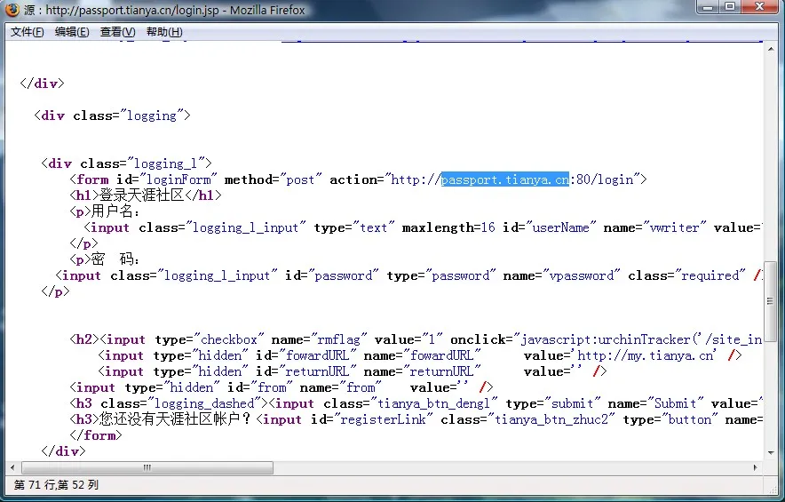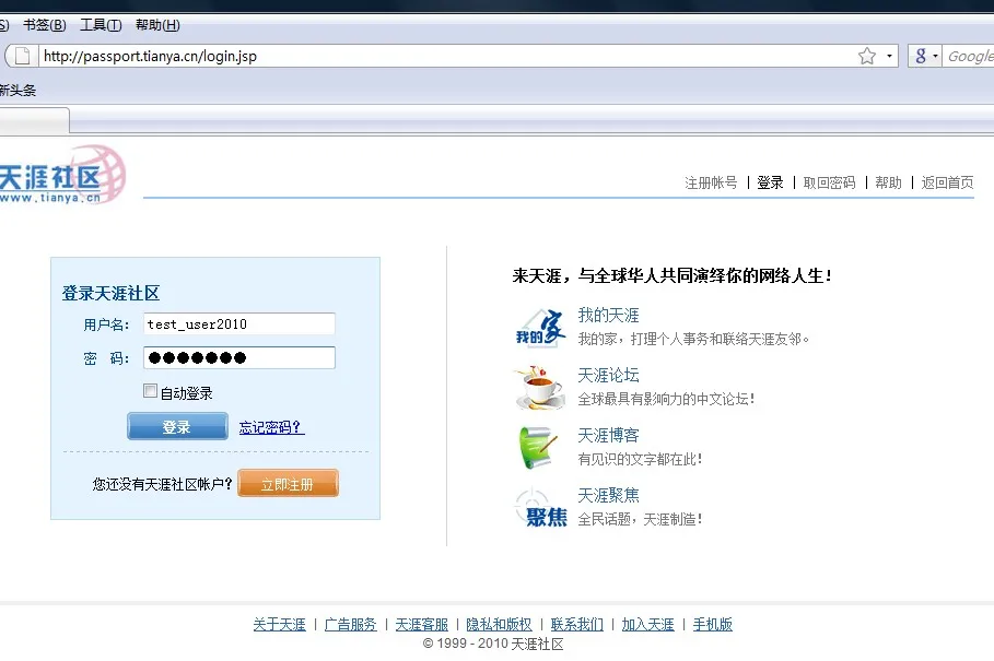 下文中涉及的站点是天涯的用户登录页面(http://passport.tianya.cn/login.jsp),下面实验中要用到已经注册的用户名test_user2010及其密码t123456 .