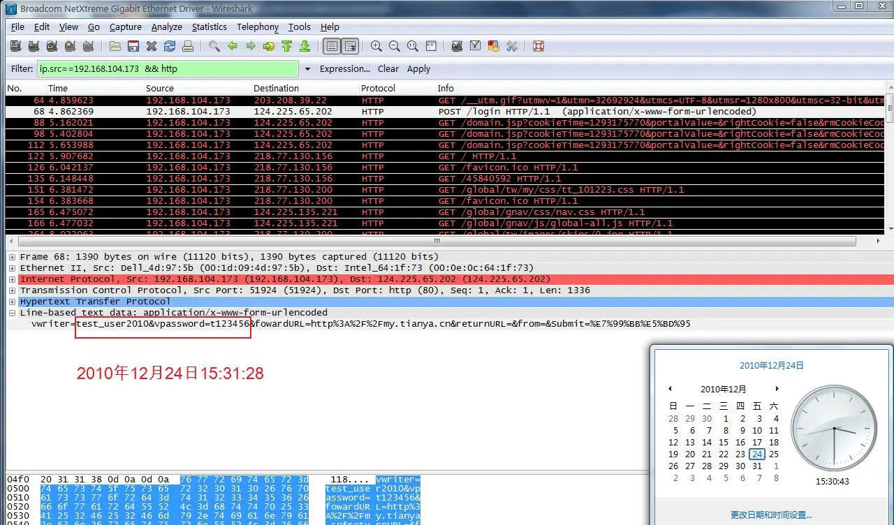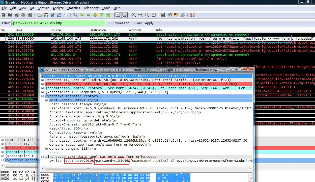 第三步,我们可以从Wireshark的监听结果中去找想要的数据,为了减小范围,我们可以在filter中输入ip.src==192.168.104.173 && http,它表示IP来源是本机IP,使用的协议是http,下面是找到的结果: