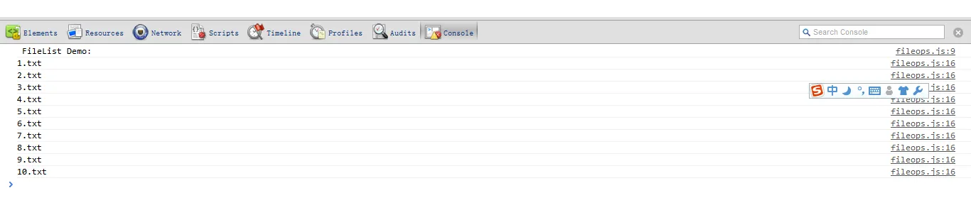最后,点击“文件上传”按钮,则会触发这段JS代码的最终执行,它用FileList进行遍历所有被选择的文件,然后依次在浏览器控制台打印出文件名,于是,控制台输出如图: