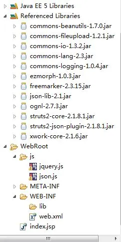 第一步:在MyEclipse中创建JavaWeb工厂并把Struts2 和 json的jar包添加到工程中添加完成后的工程图是: