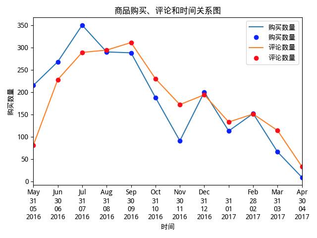 分析该商品的销售数量和评论数量和时间的关系,生成时间则线图