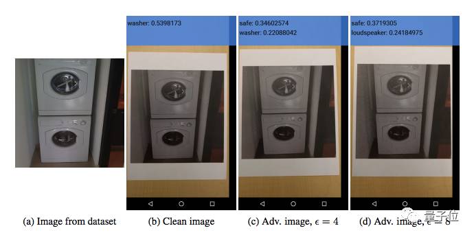 △ 例如在这张图中,经过打印、再用普通的智能手机拍照,对抗性例子仍然能使分类器将洗衣机认作保险箱