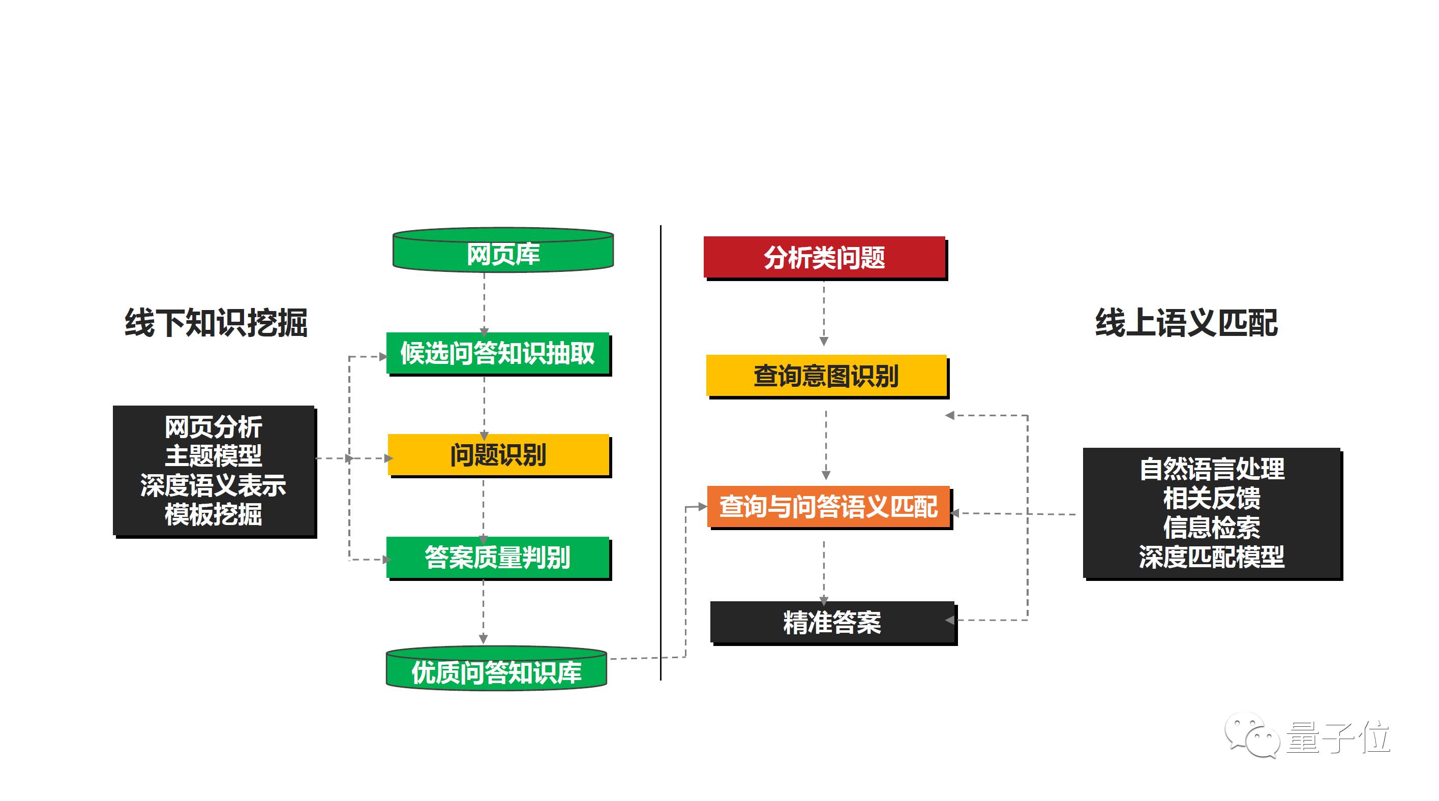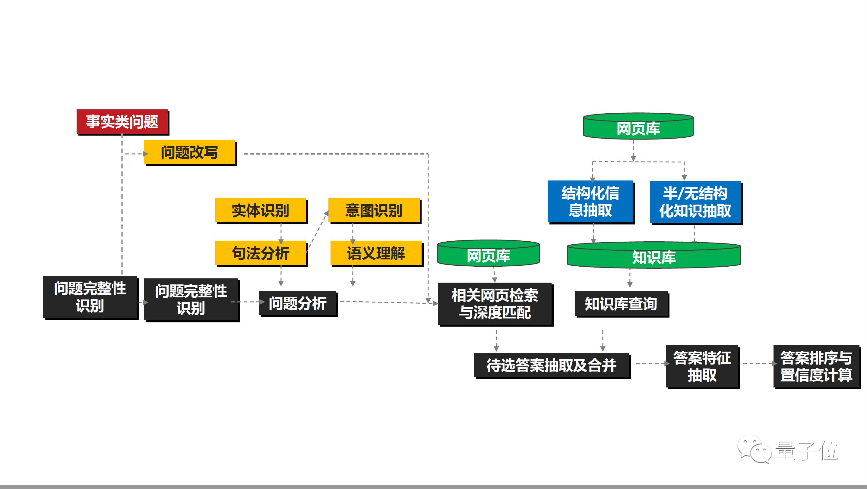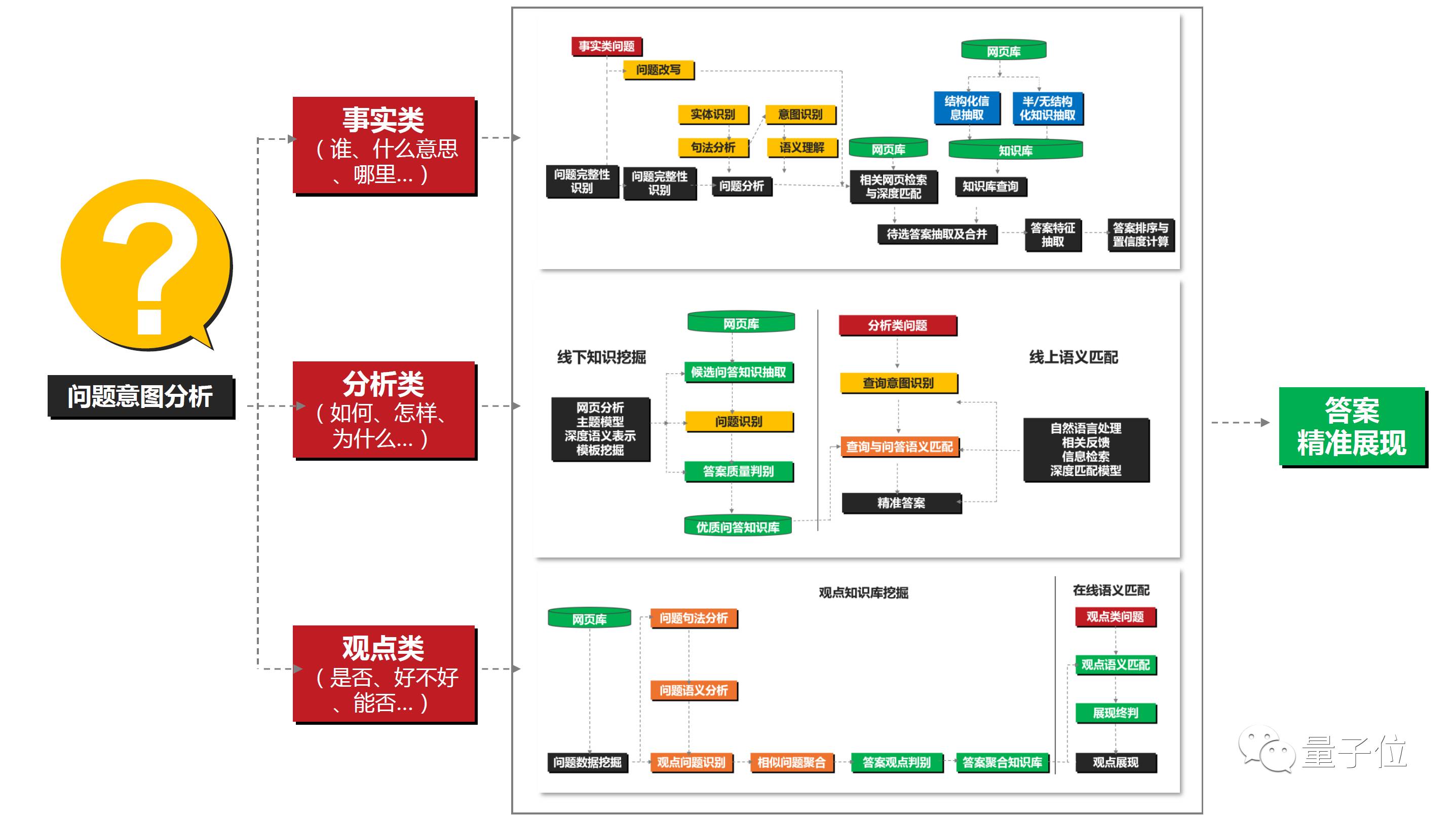 又例如问题中提到了“千湖之国”,则很有可能答案是“芬兰”(芬兰的别称是千湖之国),问题中提到了“穆斯林的葬礼”,则很有可能是问其作者“霍达”,这些信息是我们基于海量知识文本分析挖掘、学习得到的。