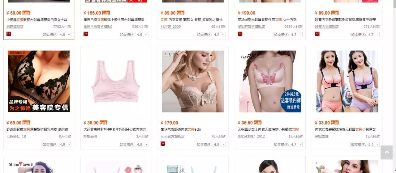 小白爬虫系列的文章,顾名思义都是写给小白的,每一篇都是楼主都会选择一个网站进行实战,因为楼主觉得爬虫是一个力气活,只有在实战中才能提高战力啊。好了,话不多说,我们选择的第一个网站是淘宝,当然这次不是大规模抓取,大规模留到进阶篇。首先我们打开淘宝的首页,然后在搜索栏输入文胸(这里只是以文胸为例子,你喜欢写啥就写啥,本人测试无论输入哪种商品都可以),结果如图: