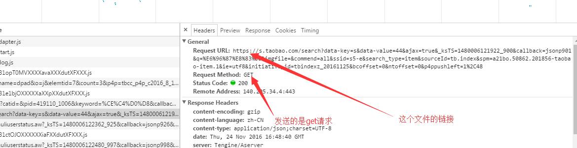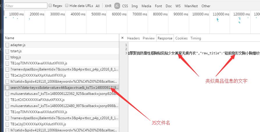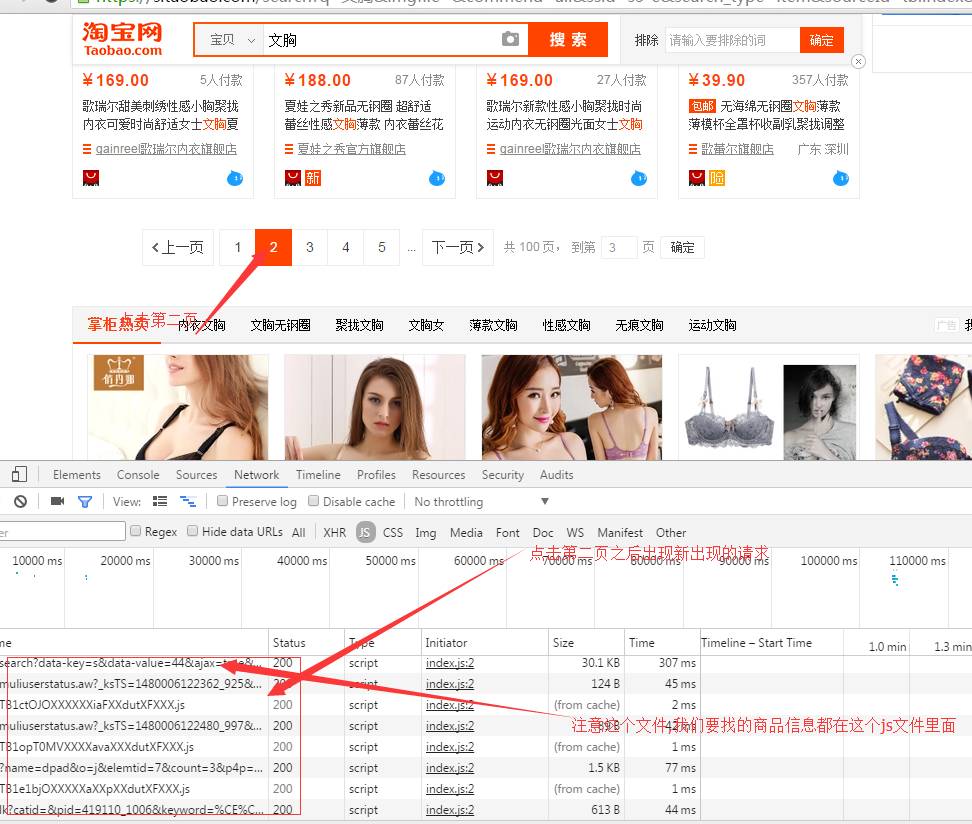 这里都是琳琅满目的文胸,然后楼主去网页的源代码看了看,商品的具体数据是JS动态加载的,不在源代码里面的,那么我们就找嘛,毕竟每页这么多的商品数据,找到这个JS文件也不难,因为淘宝的商品太多了,楼主就简单切换一下页数,果然在切换的时候抓到了这个js请求文件,如图