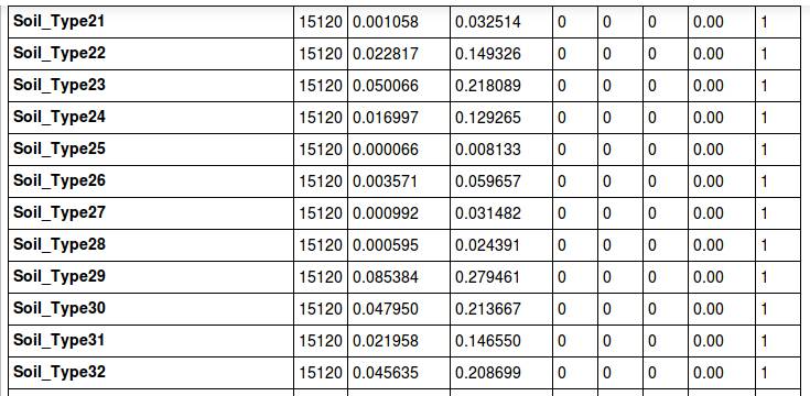 在Data Statistics的过程中,我们对数据有一个基本的认识了,因此,Wilderness_Area和Soil_Type我们不能用,谁教他是不是0就是1呢(一般我们叫它们binary)。
