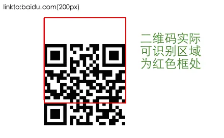 红色的色块区域是我单独为了定位区域而写的,不是在二维码本身(具体可以查看上面Demo 的源代码),用手指长按你可以看到实际可识别二维码区域为红色部分:即整体可识别区域上移了64px,而往下拉看到不同大小的二维码你会发现这个64px 的偏移量与二维码本身大小无关。友情提示:你可以用小拇指在边界区域长按以确认。