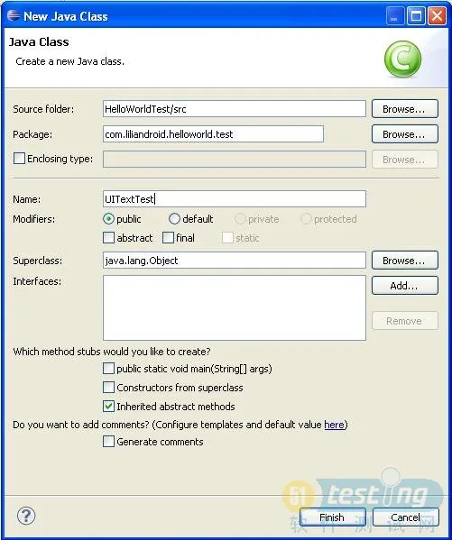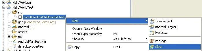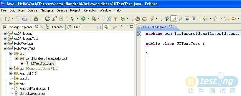 1). 在HelloWorldTest->src->com.liliandroid.helloworld.test上,右击选择New->Class,创建一个Test Case。
