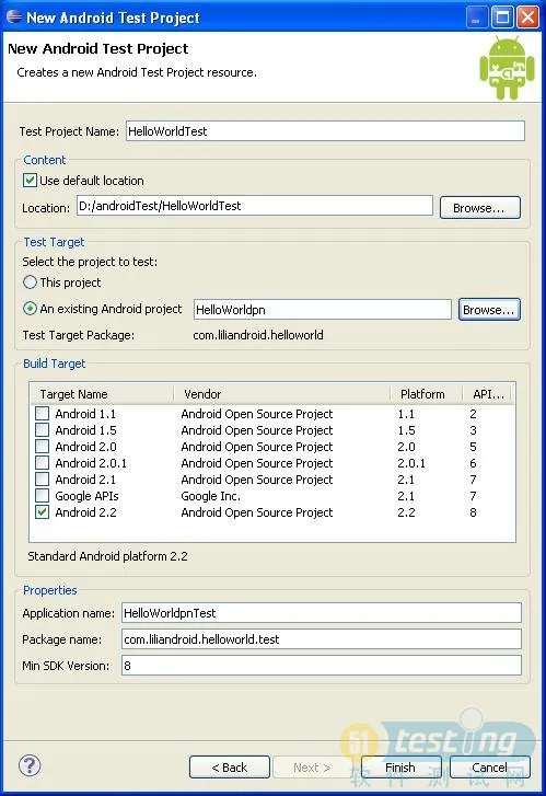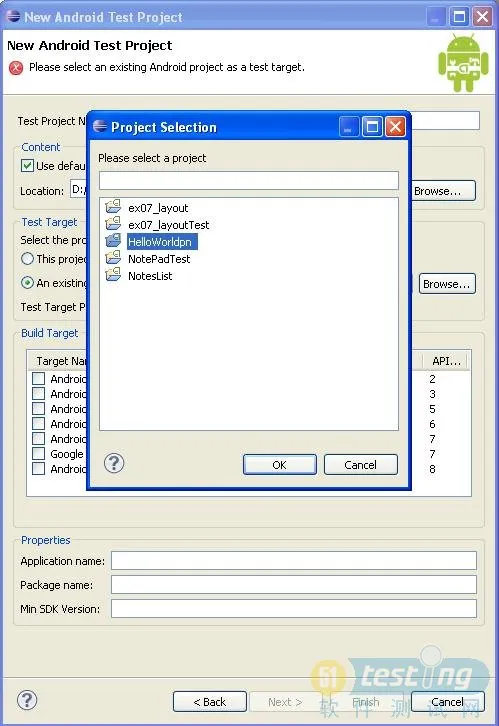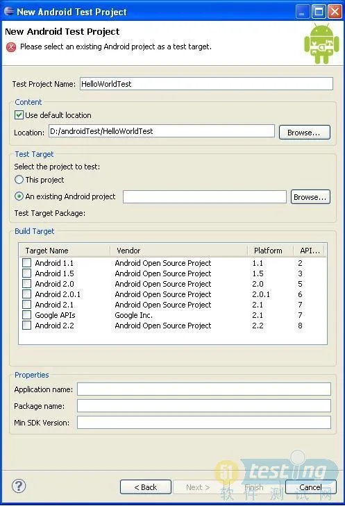 2). 在Test Project Name中输入测试工程的名称,如:HelloWorldTest。选择An existing Android Project,点击右边的Browse…按钮。