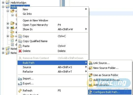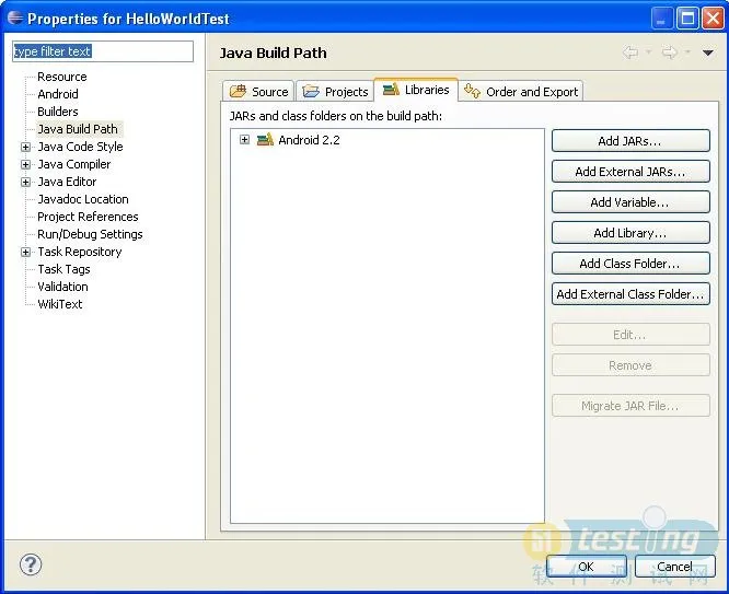 1). 选择测试工程HelloWorldTest右击,选择Build Path->Configure Build Path…