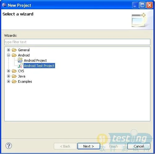 1). 打开eclipse,选择File->New->Project…->Android Test Project,点击Next。