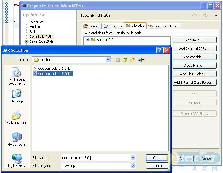 3). 因为之前创建的工程的SDK是2.2的,所以选择robotium-solo-1.8.0.jar。