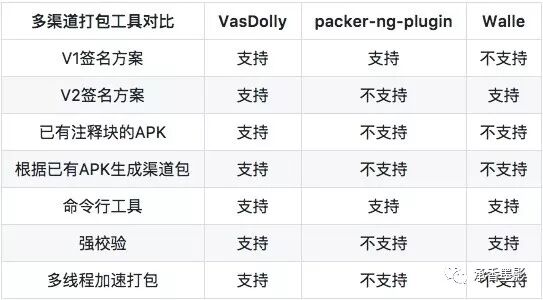 在 VasDolly 开源之前,市面上支持 v2 签名的多渠道打包方案,就属美团的 Walle 了,下面简单比对一下它们的优缺点。