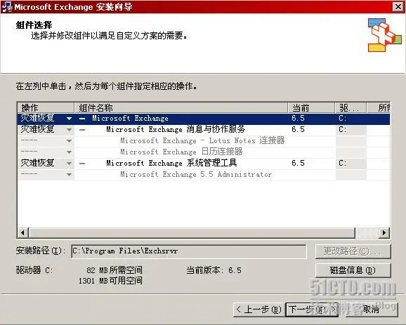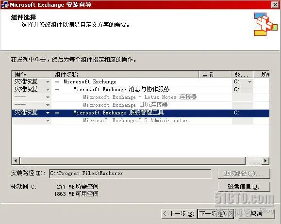 确保在“Microsoft Exchange消息与协作服务”和“Microsoft Exchange系统管理工具”两个组件上都进行“灾难恢复”操作,下一步。
