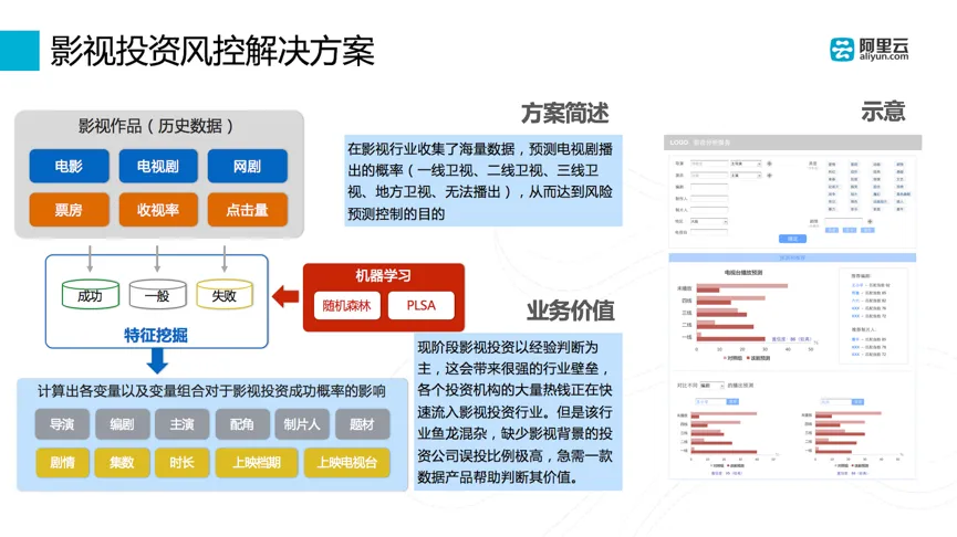 让文创有依:在娱乐影视领域,阿里云能基于多方数据源(如新浪微博的粉丝互动数据、UC上的明星搜索情况和八卦新闻、优酷土豆上的视频点播数据,以及电影票房和电视节目收视数据)综合计算出每一个明星的知名度和商业价值。将这些数据提供给影视圈内的各个商业环节,则有以下用途:帮助经纪公司评估艺人价值,更好的为旗下的每一个艺人设计商业定价策略;以及挖掘潜力新人,设计最优的培养策略;帮助品牌商挑选最match且性价比较高的代言人;帮助影视公司挑选合适的角色。这么说有点笼统,比如在影视投资上,就可以有一套方案基于剧本题材、创作班子、时下流行趋势等因素,告诉你影视上一线卫视、二线卫视、三线卫视风险是多少。“大数据就是猜那些未知的东西,通过数字化让决策变得有据可依。最后算出来这剧投资回报率是多少。”闵万里说。
