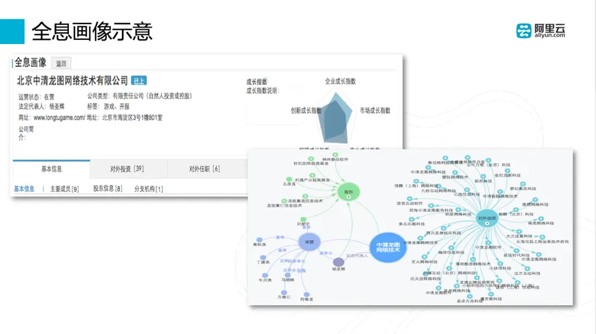 让市场有谱:阿里能通过公开的信息,深度挖掘企业与企业的关系、企业与个人的关系,从而构建出一张企业全息画像,从而在风险洞察、潜客挖掘、产品预测和品牌营销上带来价值。举一个应用例子,银行在考虑是否要给企业放贷时,这张全息图就可以成为一个非常重要的参考,因为它能一目了然这个公司财务风险、司法风险、股权风险,以及和这个企业上下游关联的所有风险。