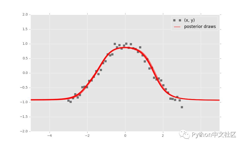 贝叶斯神经网络定义了神经网络上的分布,因此我们可以执行图形检查,将模型打印出来,看看是不是和我们一开始定义的模型,也就是一个在余弦曲线上摆动有一定的摆动的图样。