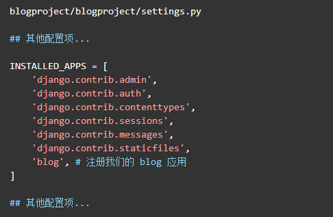 不同名称的文件用于存放特定功能的代码,这些将会在后面详细介绍。总之这个应用的文件夹结构 django 已经为我们建立好了,但目前它还只是包含各种文件的一个文件夹而已,django 并不知道这是一个应用,我们得告诉 django 这是我们创建的应用,专业一点说就是:在 django 的配置文件中注册这个应用。打开 blogproject 目录下的 settings.py 文件,看名字就知道 settings.py 是一个设置文件(setting 意为设置),找到 INSTALLED_APPS 设置项,将 blog 添加进去。