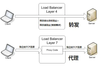 以常见的TCP为例,负载均衡设备如果要根据真正的应用层内容再选择服务器,只能先代理最终的服务器和客户端建立连接(三次握手)后,才可能接受到客户端发送的真正应用层内容的报文,然后再根据该报文中的特定字段,再加上负载均衡设备设置的服务器选择方式,决定最终选择的内部服务器。负载均衡设备在这种情况下,更类似于一个代理服务器。负载均衡和前端的客户端以及后端的服务器会分别建立TCP连接。所以从这个技术原理上来看,七层负载均衡明显的对负载均衡设备的要求更高,处理七层的能力也必然会低于四层模式的部署方式。