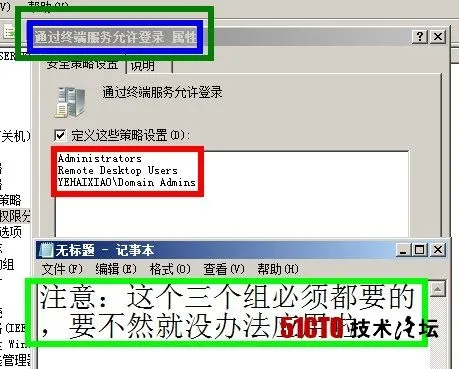 8.选择“通过终端服务允许登录”,并添加Remote Desktop Users组。如果这里只添加这一个组,就没办法应用出来啦。注意这里一定要加上domain admins 和administrators 才可以应用,确定出来。