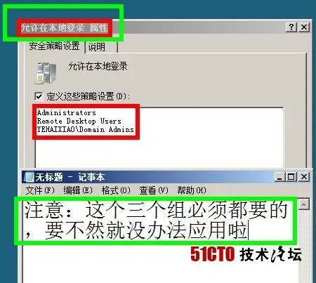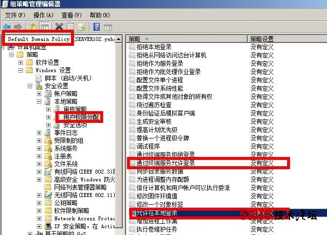7.选择“允许在本地登录”,并添加Remote Desktop Users组。如果这里只添加这一个组,就没办法应用出来啦。注意这里一定要加上domain admins 和administrators 才可以应用,确定出来。