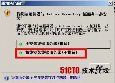 17.选择“终端服务”会有一个提示,但如果想普通user也能远程服务器,那么就要安装此服务才行