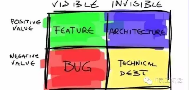 最上面这张图比较直观的体现了技术债的一种定义,是负面的,消极的,不可见的。