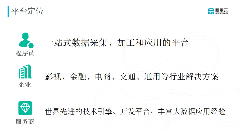 面对不同的用户,数加平台定位也各不相同。对于开发者而言,它是一站式数据采集、加工和应用的平台;面向企业用户,数加平台提供了影视、金融、电商、交通、通用等行业解决方案;面向服务商,数加平台提供的更多是行业内先进的技术引擎、开发平台,丰富大数据应用经验。