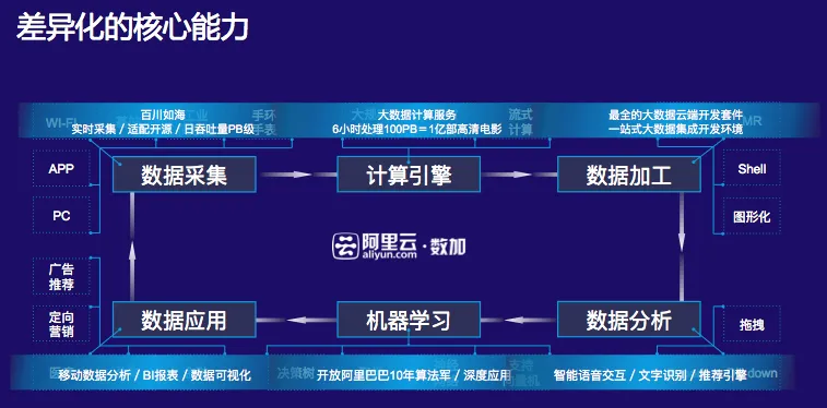 数加平台和其他服务差异化的地方在于,其不仅提供了数据计算和存储能力,还提供了大数据整体端到端的应用闭环,他不仅能帮用户采集数据,还能帮大家如何用数据。