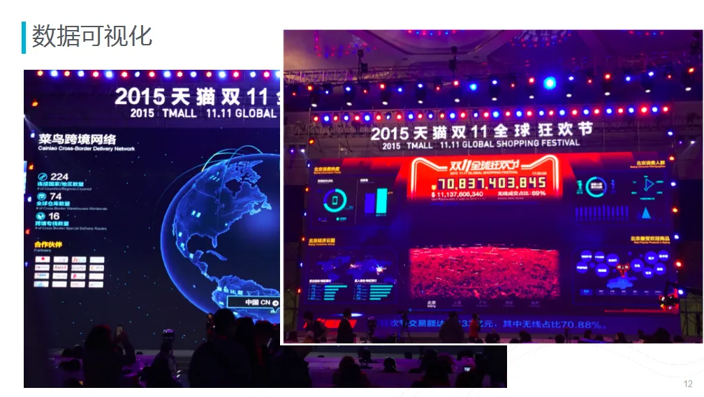 数据可视化有一种呈现方式,叫数据大屏。从下图可以看到,每年双十一的时候,阿里巴巴都会展示一个数据媒体大屏,其中包括实时数据的的演示和逻辑分析。其背后包括大量实时数据的计算、处理和多维的分析。