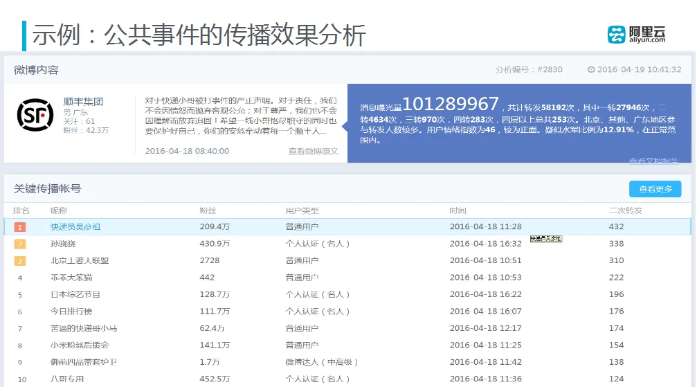 上图是对顺丰快递员被打案例的分析,经过追踪分析发现:后续有四层传播,整个传播量达到一亿以上,转发量达到五万余次,同时可以分析出每次转发背后人的感情指数的趋势。