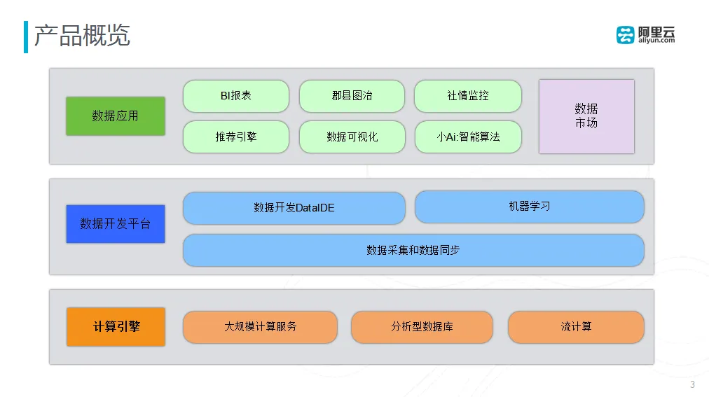 在最底层,是阿里云强大的数据计算引擎。值得注意的是,这里所有的计算能力都是经历过阿里巴巴双十一活动的洗礼,每一年随着业务的巨大增速,进而拥有质的飞跃,他的稳定性、安全性、计算能力每年都会参加考试,然后提升,这也是区别于市场上的开源产品一个特点。