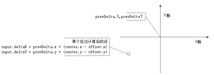 以prevDelta的X和Y作为原点,center中的X和Y会随着移动而改变,offset就是第一次接触屏幕的点的clientX与clientY。