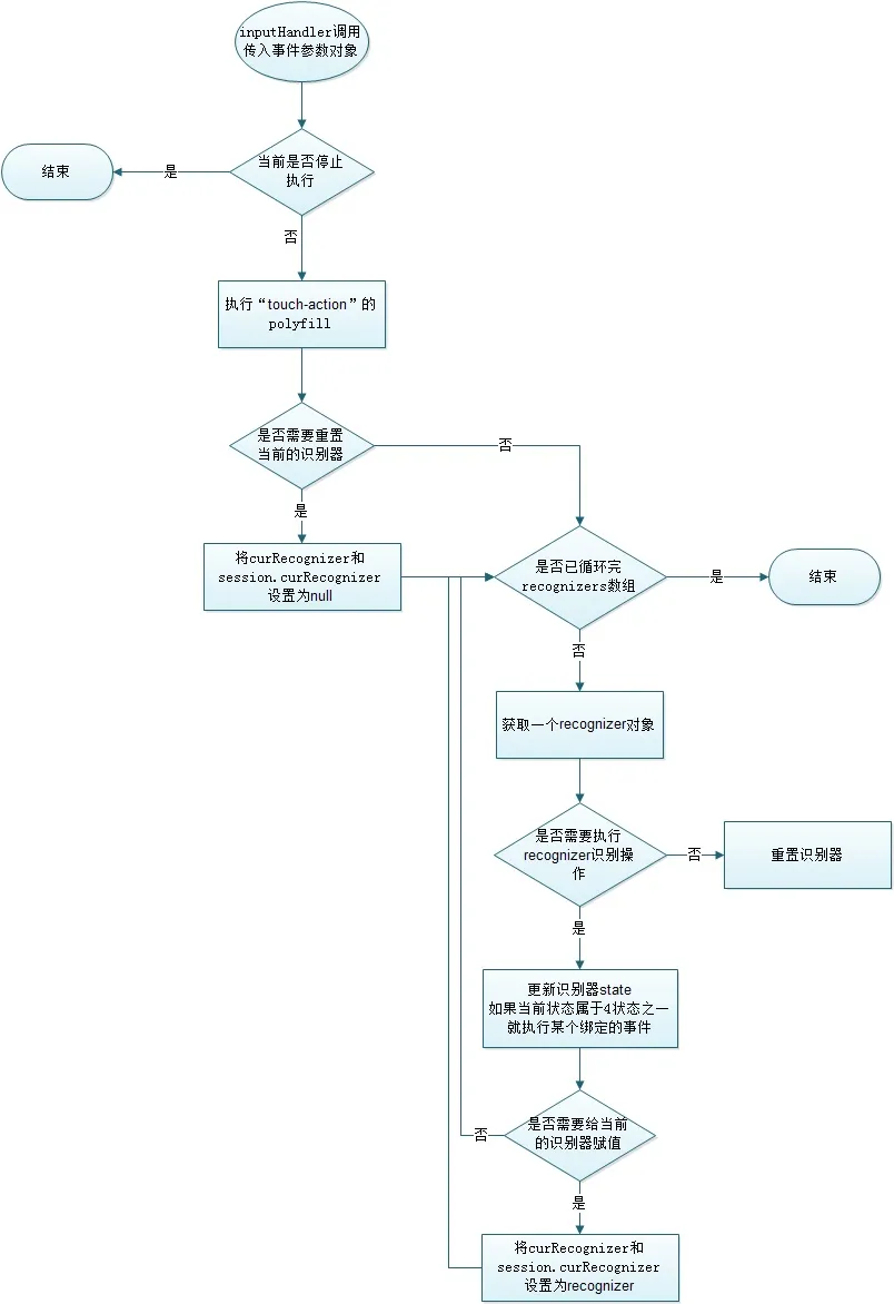 recognize: function(inputData) { var session = this.session;//全局缓存,在Input对象中会用到 if (session.stopped) {//在stop方法中可以设置,有两个选项 return; } // 执行CSS属性“touch-action”的 polyfill this.touchAction.preventDefaults(inputData); var recognizer; var recognizers = this.recognizers;//在Hammer或外面调用add添加的识别器数组 // 每个识别器有四个状态:BEGAN, CHANGED, ENDED 和 RECOGNIZED // 如果curRecognizer还没设置就是 `null` var curRecognizer = session.curRecognizer; // 如果是一个新的或当前识别器的状态为RECOGNIZED,就重置为null if (!curRecognizer || (curRecognizer && curRecognizer.state & STATE_RECOGNIZED)) { curRecognizer = session.curRecognizer = null; } var i = 0; while (i < recognizers.length) { recognizer = recognizers[i]; // 满足下面的条件就执行识别器的recognize方法,否则重置 // 1. 缓存的stopped不能是FORCED_STOP状态 // 2. curRecognizer还未设置或curRecognizer与循环中的recognizer相同 // 3. recognizer设置了可以与curRecognizer同时执行,这里有个识别器recognizeWith的概念后面会讲到 if (session.stopped !== FORCED_STOP && ( // 1 !curRecognizer || recognizer == curRecognizer || // 2 recognizer.canRecognizeWith(curRecognizer))) { // 3 recognizer.recognize(inputData); } else { recognizer.reset(); } // curRecognizer为空,并且recognizer的状态是STATE_BEGAN、STATE_CHANGED和STATE_ENDED中的一个 if (!curRecognizer && recognizer.state & (STATE_BEGAN | STATE_CHANGED | STATE_ENDED)) { curRecognizer = session.curRecognizer = recognizer;//设置curRecognizer与session.curRecognizer } i++; } }