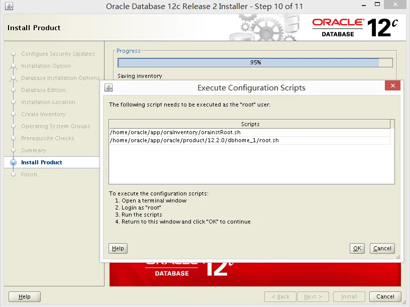 root执行完点击ok,12c软件安装结束。