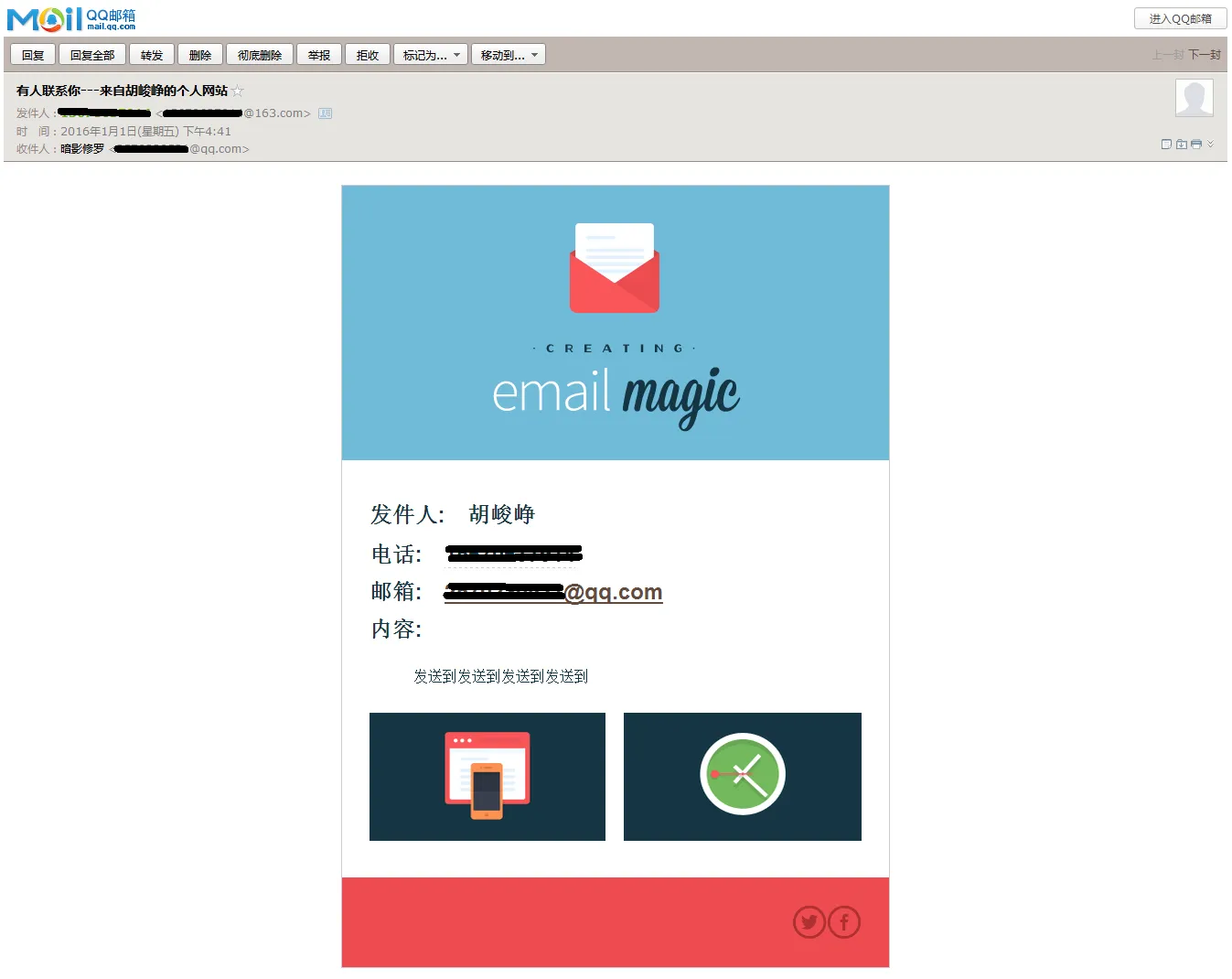public class MailAction extends ActionSupport{ private MailForm mailForm; public MailForm getMailForm() { return mailForm; } public void setMailForm(MailForm mailForm) { this.mailForm = mailForm; } //添加内嵌图片 private MimeBodyPart createImageMimeBodyPart(String imageName) throws MessagingException, UnsupportedEncodingException{ FileDataSource fds=new FileDataSource(ServletActionContext.getServletContext().getRealPath("/image")+"/" + imageName + ".gif"); MimeBodyPart mbp=new MimeBodyPart(); DataHandler dh=new DataHandler(fds); mbp.setDataHandler(dh); //设置对应的资源文件的唯一标识符,即 MIME 协议对于邮件的结构组织格式中的 Content-ID 头字段; mbp.setHeader("Content-ID", imageName); mbp.setFileName(MimeUtility.encodeText(fds.getName())); return mbp; } public String sendMail(){ try { HttpServletRequest request = ServletActionContext.getRequest(); String pwd = "************";//发件人邮箱密码 String mailfrom = "***********@163.com"; //网易的邮箱 String wangyiFrom = mailfrom.substring(0, mailfrom.indexOf('@'));//网易邮箱的用户名 String tu = "163.com"; //发件人邮箱的后缀域名 String tto= "**********@qq.com"; //接收邮件的邮箱 String ttitle= "有人联系你---来自胡峻峥的个人网站"; //根据其物理路径,得到XML的模板 String XML_path = ServletActionContext.getServletContext().getRealPath("/mailTemplate")+"/myMailTemplete.xml"; String str=new ReaderXML().read(XML_path); Object[] obj=new Object[]{mailForm.getName(), mailForm.getPhone(), mailForm.getE_mail(), mailForm.getContent(), "e_mail", "left", "right", "tw", "fb"}; //MessageFormat可以格式化这样的消息,然后将格式化后的字符串插入到模式中的适当位置 String tcontent = MessageFormat.format(str, obj); Properties props=new Properties(); props.put("mail.smtp.host","smtp."+tu);//邮箱SMTP服务器地址端口 props.put("mail.smtp.auth","true");//这样才能通过验证 Session s=Session.getInstance(props); s.setDebug(true); MimeMessage message=new MimeMessage(s); //给消息对象设置发件人/收件人/主题/发信时间 InternetAddress from; from = new InternetAddress(mailfrom);//发件人的qq邮箱 message.setFrom(from); InternetAddress to=new InternetAddress(tto);//收件人的邮箱 message.setRecipient(Message.RecipientType.TO,to); message.setSubject(ttitle); message.setSentDate(new Date()); //给消息对象设置内容 BodyPart mbp=new MimeBodyPart();//新建一个存放信件内容的BodyPart对象 mbp.setContent(tcontent,"text/html;charset=gb2312");//给BodyPart对象设置内容和格式/编码方式 // 用于组合文本和图片,"related"型的MimeMultipart对象 Multipart mm=new MimeMultipart("related");//新建一个MimeMultipart对象用来存放BodyPart对象(事实上可以存放多个) mm.addBodyPart(mbp);//将BodyPart加入到MimeMultipart对象中(可以加入多个BodyPart) //添加图片 mm.addBodyPart(createImageMimeBodyPart("e_mail")); mm.addBodyPart(createImageMimeBodyPart("left")); mm.addBodyPart(createImageMimeBodyPart("right")); mm.addBodyPart(createImageMimeBodyPart("tw")); mm.addBodyPart(createImageMimeBodyPart("fb")); message.setContent(mm);//把mm作为消息对象的内容 message.saveChanges(); Transport transport=s.getTransport("smtp"); transport.connect("smtp."+tu, wangyiFrom, pwd); //这里的wangyiFrom为发件人网易账号 transport.sendMessage(message,message.getAllRecipients()); transport.close(); ActionContext.getContext().getSession().put("operations", "邮件发送成功, 请耐心等待回复!"); } catch (Exception e) { System.out.println(e.toString()); ActionContext.getContext().getSession().put("errors", e.toString()); return "errors"; } return "sendMail"; } }